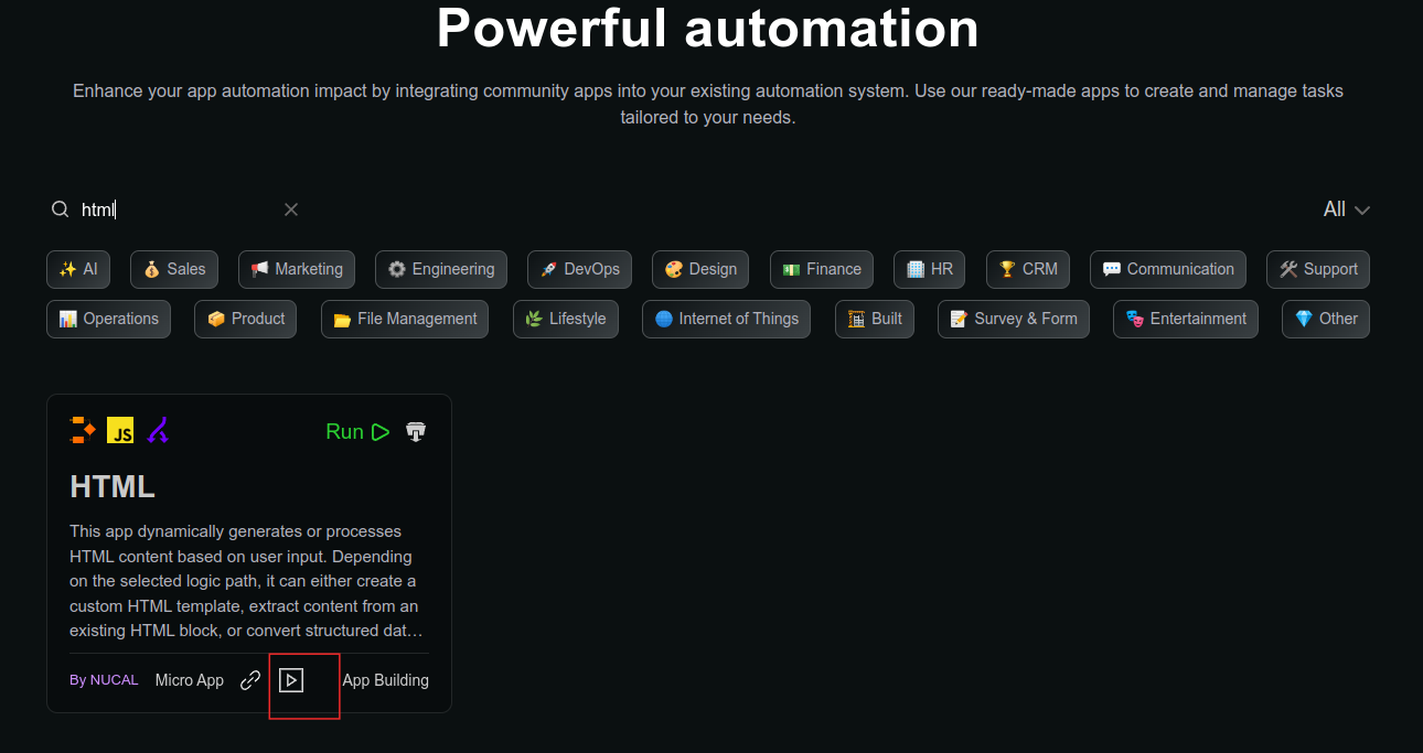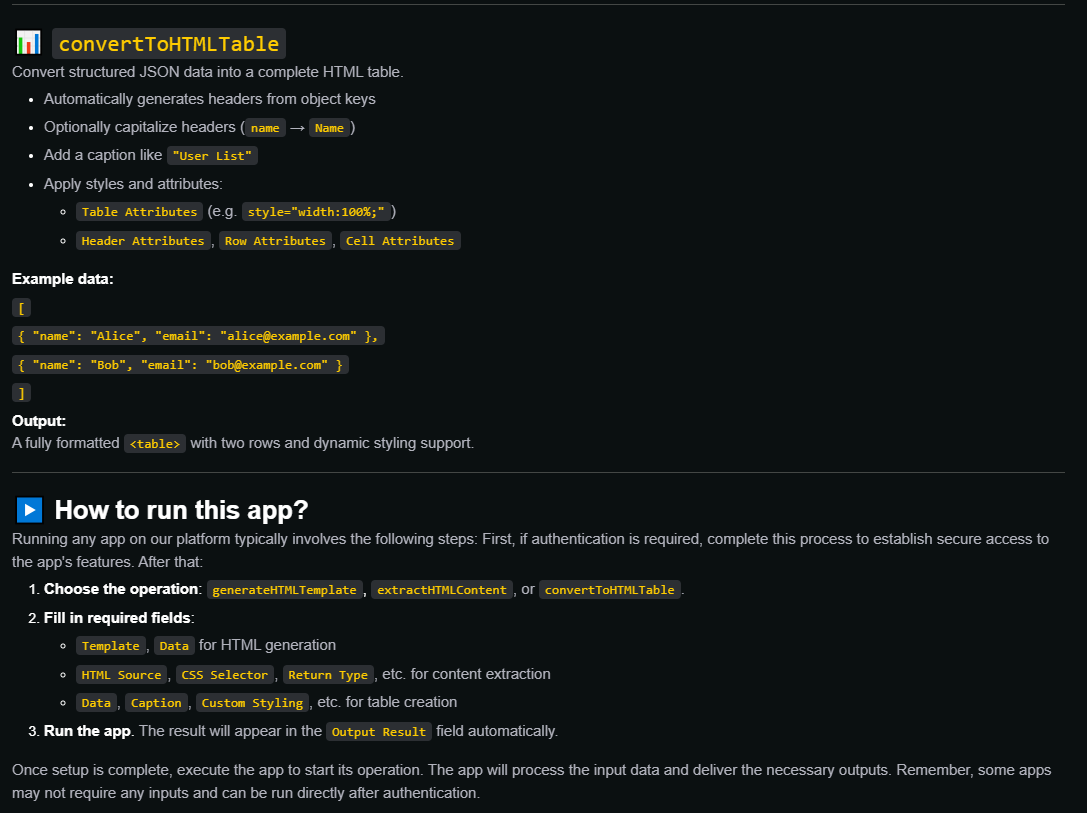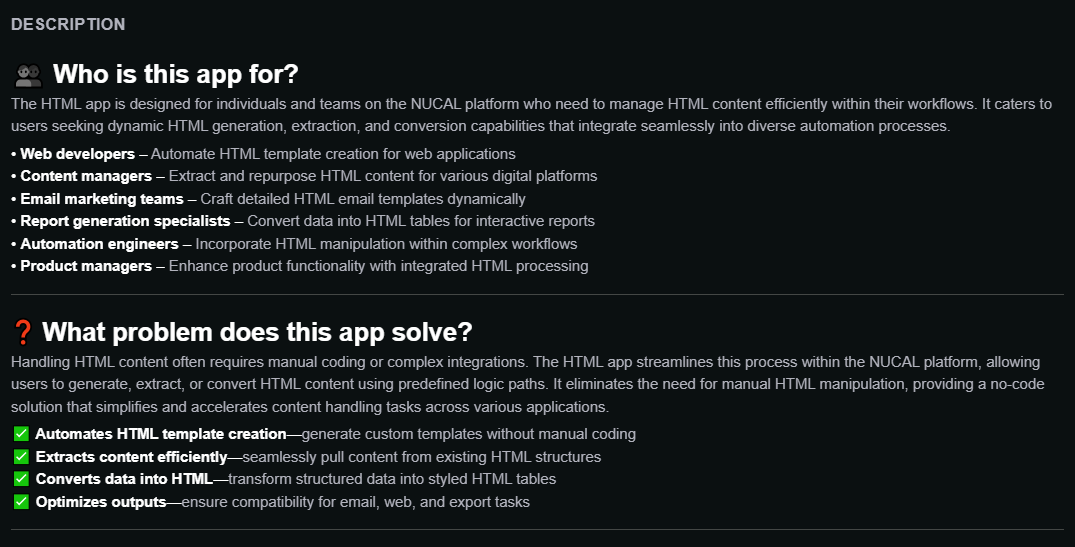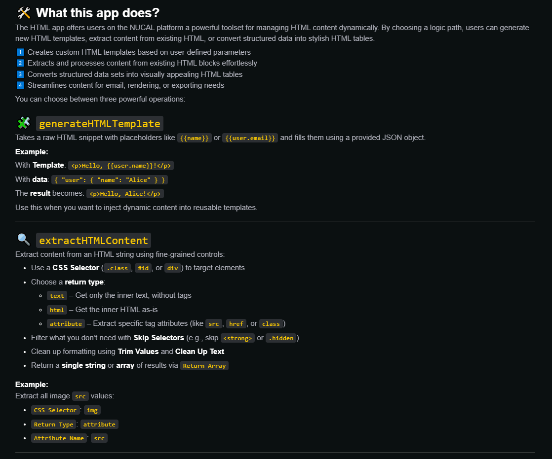 NUCAL help documents include examples of all our available nodes and how to use them. You can develop the app you want to build by reviewing these. You can also benefit from integrations in your apps, which offer many action capabilities. Iâm leaving the links below. We will be developing the necessary enhancements for the âHTML Extractâ and other upcoming nodes. Thank you for your feedback.